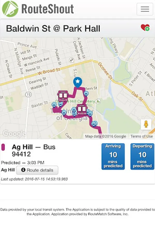 Note: You may have limited access if data is not supplied to RouteShout from your local transit system. Data is provided by your local transit system. Application is subject to the quality of data provided to the Application. The Application is provided by RouteMatch Software at TripSpark Technologies.