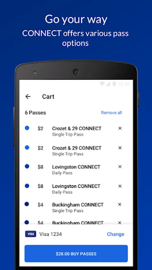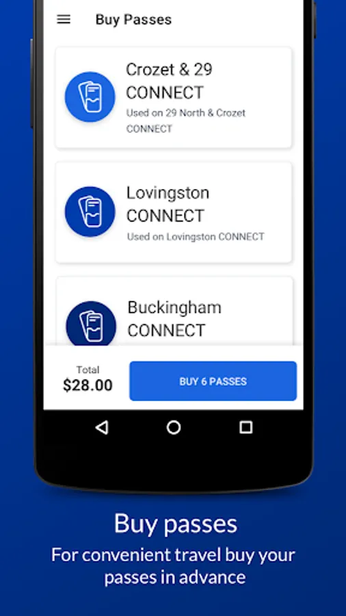 CONNECT Pay is your digital payment application to quickly and conveniently access CONNECT transit services. CONNECT transit services are the comfortable and convenient way to ride from Albemarle, Nelson, and Buckingham, into Charlottesville. With CONNECT Pay, you can purchase and store tickets in advance of riding and board without the hassle of handling cash. Frequent riders can save money through weekly and monthly passes. Group ticket purchases allow a single app user to purchase tickets for friends and family.
