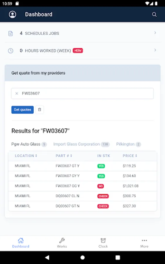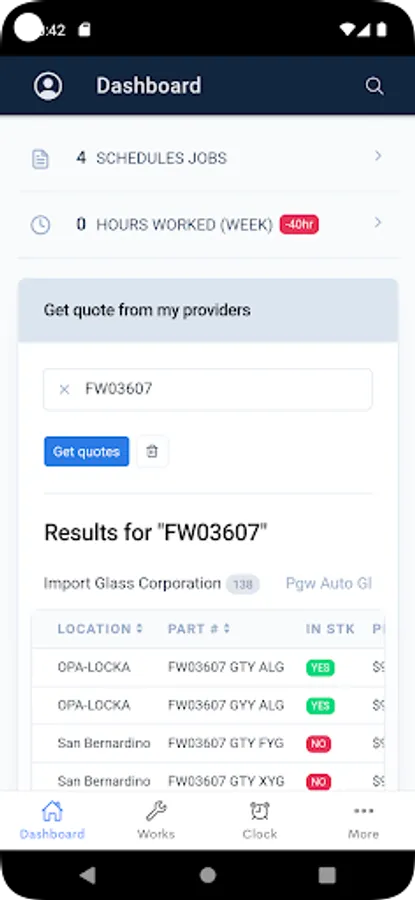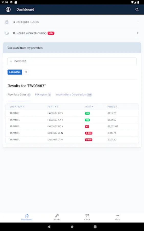 This tool has been developed to help our clients to grow. RouterGlass has great features, such as obtaining quotes from several glass suppliers simultaneously, which is a great help to streamline work. It has job management, an integrated map, and a time clock. It also allows searches by VIN, part number and by year, make and model.