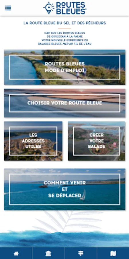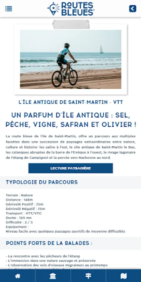 Les Routes Bleues de la Narbonnaise is a digital guide that helps you find local and interactive information (history, nature, leisure activities, services, security, etc.). It is coupled with a connected Travel Book 2.0 and QR Codes inserted on different signage over more than 60 kilometers of journey. For each route, you have access to complementary activities, original experiences, essential visits, good addresses, online media consultation: 360 ° landscape readings, videos, interviews ...