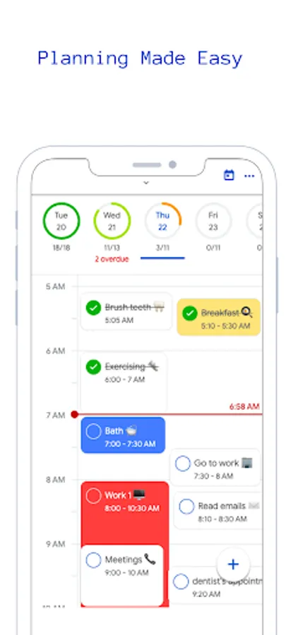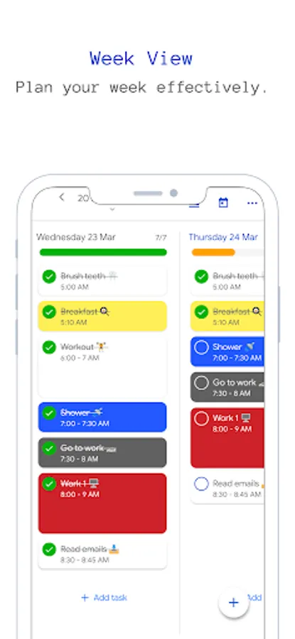 View your agenda as 7 days section view and each section display hour by hour to serve as a daily agenda planner, each hour has a horizontal todo list that displays todos that you need to do in that particular hour, each day section display a progress bar that shows how many remaining todos in your agenda, so by the end of the day you can know if you completed all of your todos, then you can plan for the next day agenda.