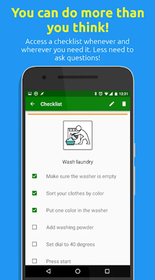 - Checklists: Each step has an image and a description. The steps can be checked off one-by-one.
