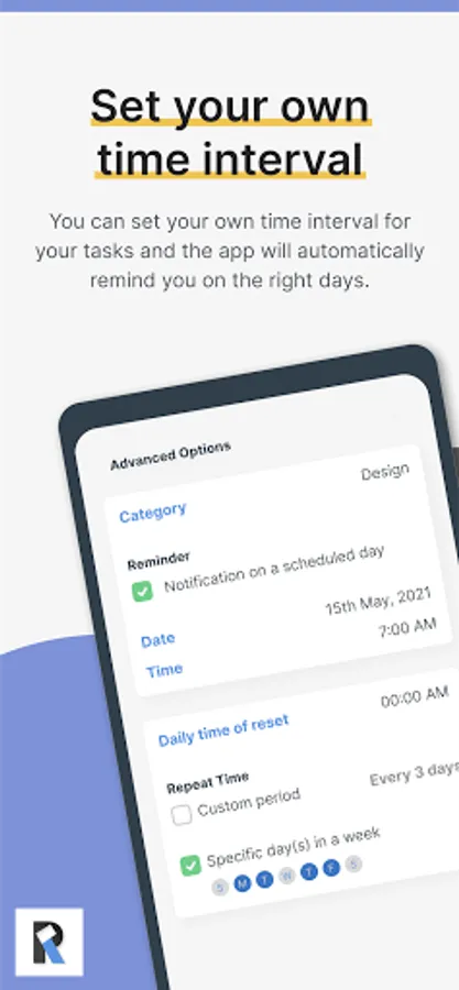 You can set your own time interval for your tasks and the app will automatically remind you on the right days.