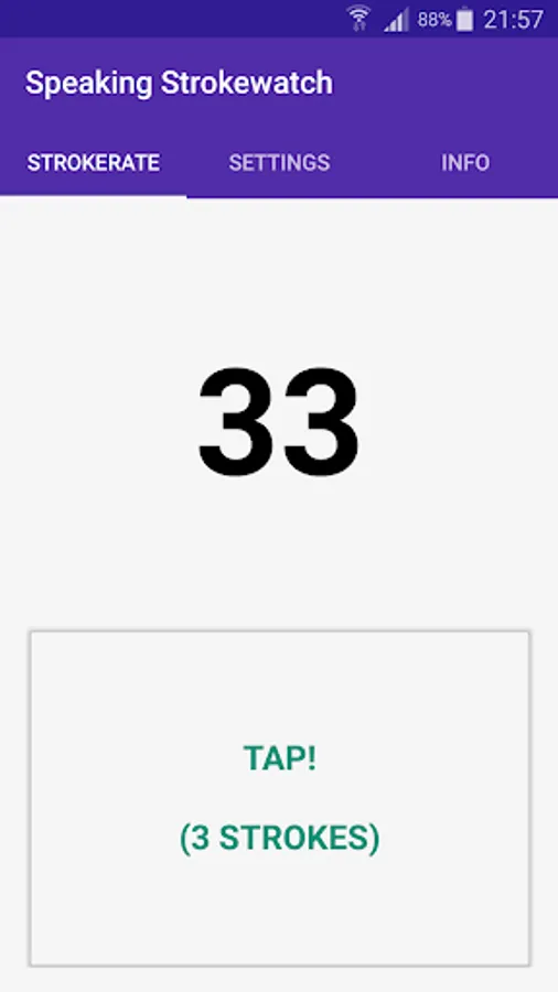 Tap the button at the catch of each three completed stroke-cycles and the App automatically calculates the current stroke-rate per minute and will also read it out loud to you.