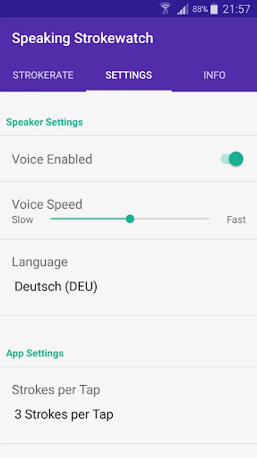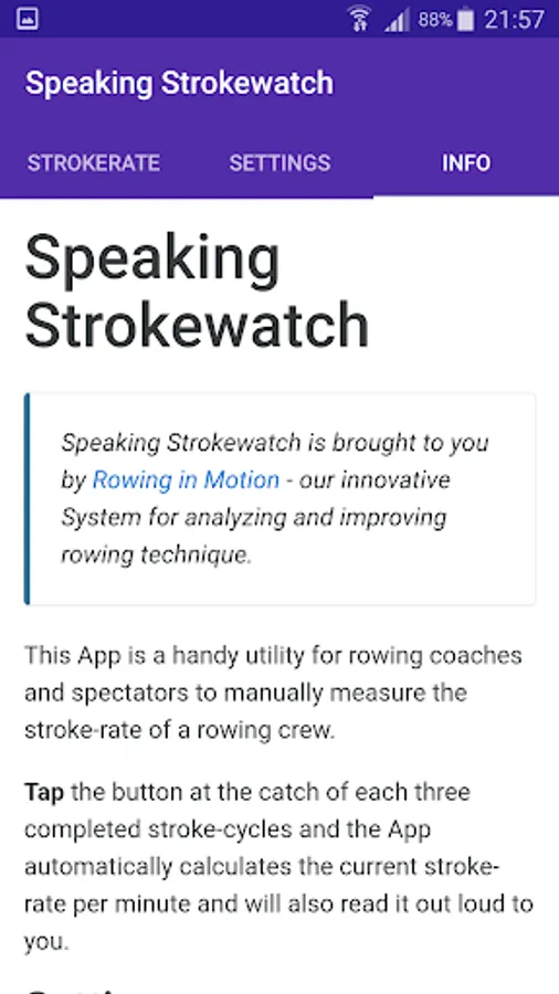 Speaking Strokewatch is an intuitive stroke watch that will not only show you but also tell you the measured stroke rate via text-to-speech. This App relieves Coaches from keeping an eye on their athletes and a stroke watch at the same time.
