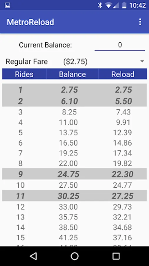 - Displayed list shows the "Reload" amount to achieve the number of rides.