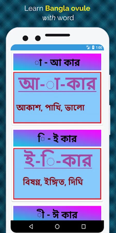 This is the right app for learning the Bengali language. if you don't have any idea of the alphabet then you can install this. You can read and write the Bengali and English alphabet and numbers also will learn The rhythm. You will enjoy playing with this app and will learn the alphabet with pictures quickly.