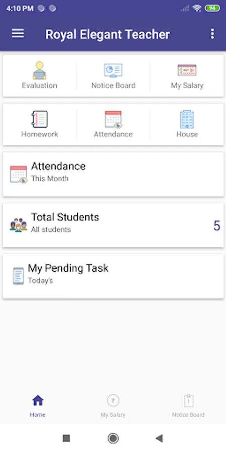 Royal Elegant Teacher App is Advanced School Management System that fit for each & every educational institutes. It will help with all operations like student admission, fees collection and exam results. It includes various modules and some inbuilt users (Super Admin, Admin, Accountant, Teacher, Parent and Student) panel.
