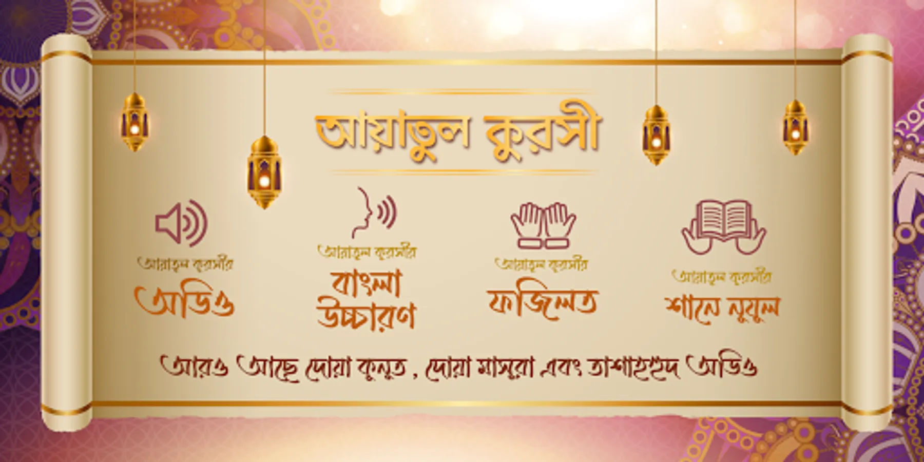 আয়াতুল কুরসি ( ayatul kursi bangla) , দোয়া কুনুত (Dua qunoot bangla) , দোয়া মাসুরা (Dua masura bangla) এবং তাশাহহুদ অডিও নিয়ে আমাদের এই মাসনুন দোয়া ( dua & zikr apps) অ্যাপটি সাজিয়েছি । অ্যাপটি আপনাকে খুব সহজে নামাজের জন্যে এসকল প্রয়োজনীয় ও গুরুত্বপূর্ণ দোয়াগুলো শিখে নিতে পারবেন । সুরা বাক্বারাহ ২৫৫ নং আয়াত কে আয়াতুল কুরসী (Ayatul kursi surah) বলা হয়ে থাকে । অনেকে আয়াতুল কুরসীকে আলাদা একটি সুরা মনে করে থাকে কিন্তু আয়াতুল কুরসী মুলত একটি সুরার অংশবিশেষ । আয়াতুল কুরসীর ফজিলত ও শানে নুযুল জানতে পারবে আমাদের এই অ্যাপটি থেকে। আয়াতুল কুরসীর বাংলা উচ্চারণ , আরবী এবং অডিও (Ayatul kursi audio mp3) জানতে পারবেন খুব সহজেই। বিতরের নামাজের জন্যে গূরুত্বপুর্ন দোয়া (Dua qunoot bangla) দোয়া কুনুত অনেকেই পারেন না শুদ্ধভাবে । দুয়া কুনুত ( Dua qunoot audio) ও আরবী , বাংলা উচ্চারণ এবং অডিও দেয়া হয়েছে। এছাড়া নামাজের বৈঠকের গূরুত্বপূর্ণ দোয়া সমূহ তাশাহহুদ অডিও এবং দোয়া মাছুরা (Dua masura bangla audio mp3 ) বাংলা উচ্চারণ ও আরবি অডিও তিলওয়াত সহকারে দেয়া হয়েছে।