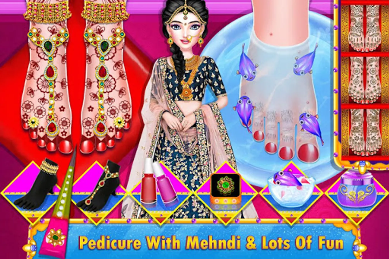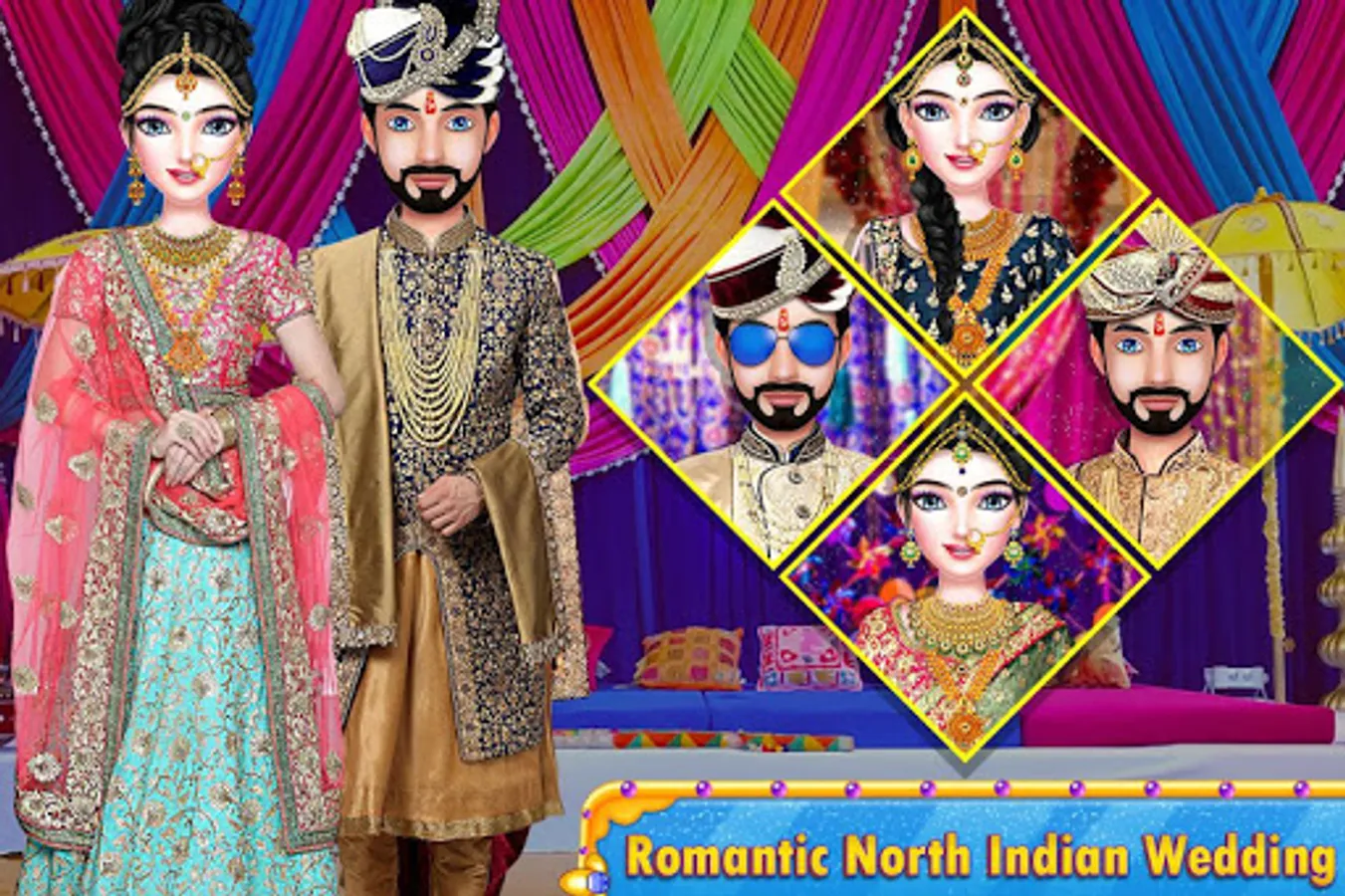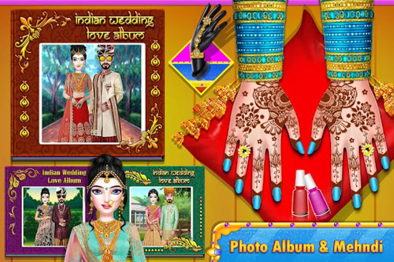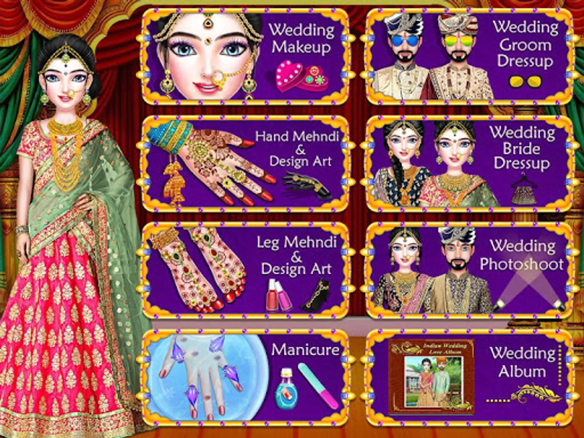 North Indian Bollywood star wedding love with girl arrange marriage rituals: Ready for royal wedding views! pedicure, manicure, face spa, hand mehndi, makeup, leg mehndi, groom dress up, hand & leg design art, bride dress-up, photo shoot, wedding album, and many more levels in Indian love marriage game.