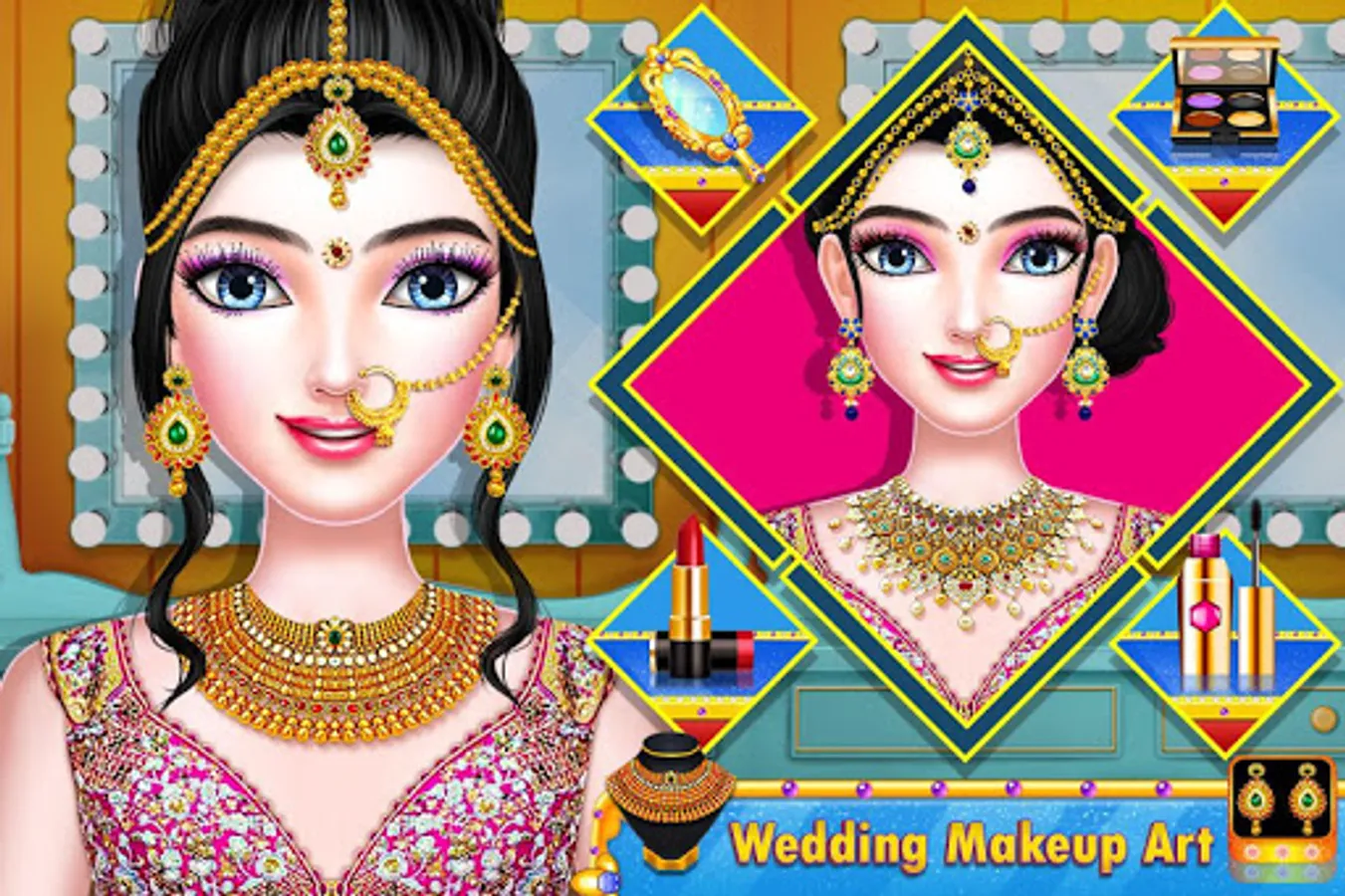 Glamorous makeup artist which includes charming lipsticks, eye lenses, blushes, eye shadows with unique hairstyle. Photography & fashionable princess in Indian celebrity royal wedding game. Discover north Indian Bollywood star wedding with Indian doll romantic wedding.