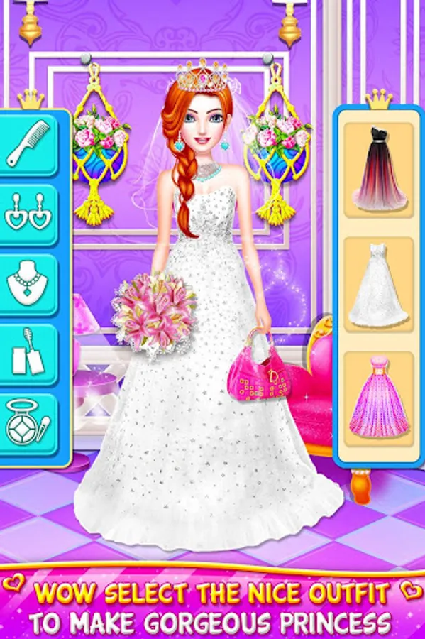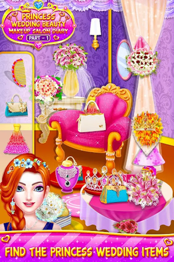 This game involves so many activities like: princess fashion salon activities, sweet princess makeover activities, dress up activities. Find some hidden item like hidden object, shoes, purse, flowers, crown, veil, castle cleaning activities, wedding party preparations, Stage decoration.