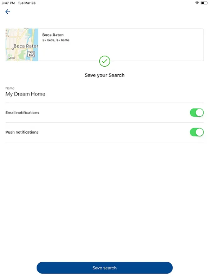 • Receive notifications on saved searches, favorited listing updates, and community updates