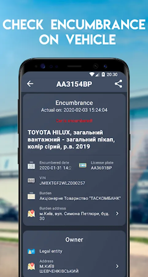 20. Information on all types of restrictions on cars. (Debts, arrests, banks, loans)