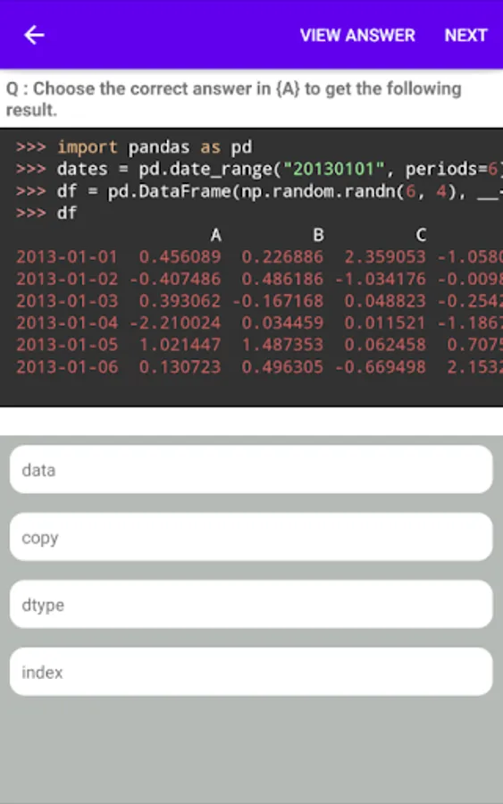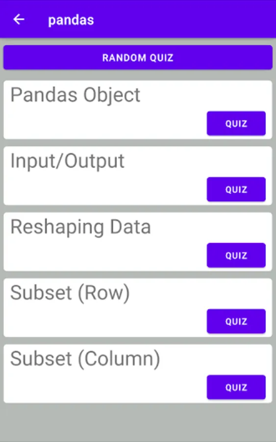 Currently, this app has quizzes about the Numpy, Pandas library.