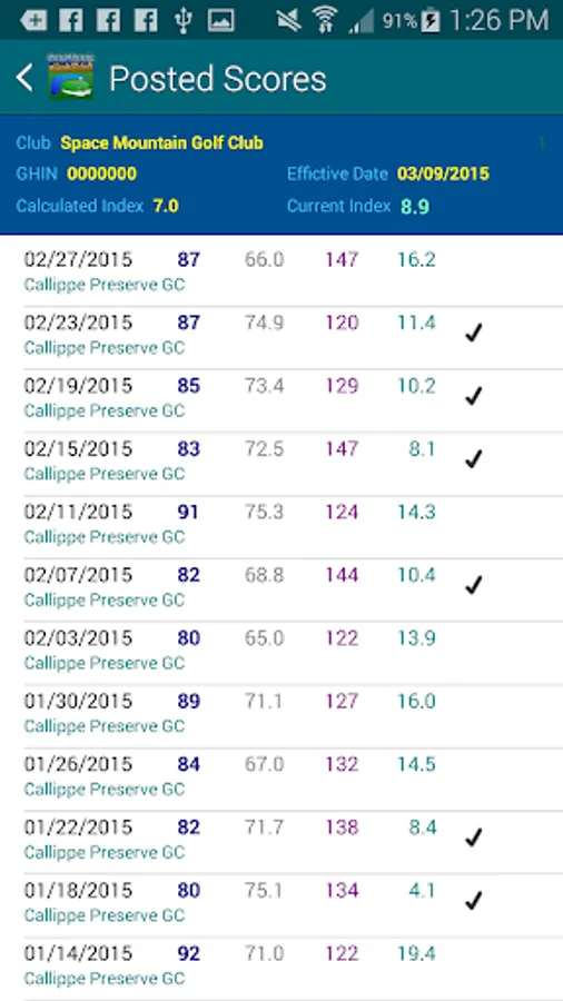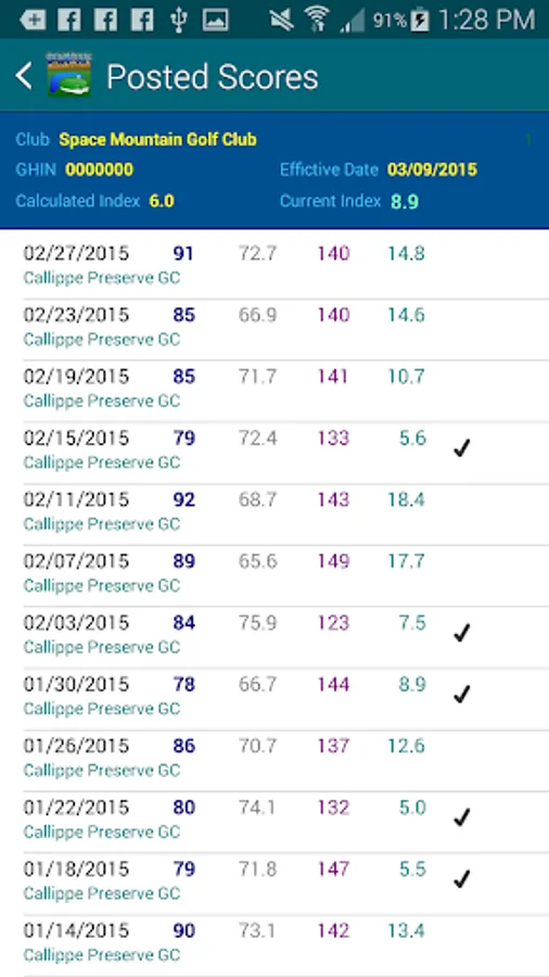 Golf Tools Tour will display your last twenty rounds entered into GHIN. Your current handicap index is displayed and so is your projected (calculated) new handicap index.