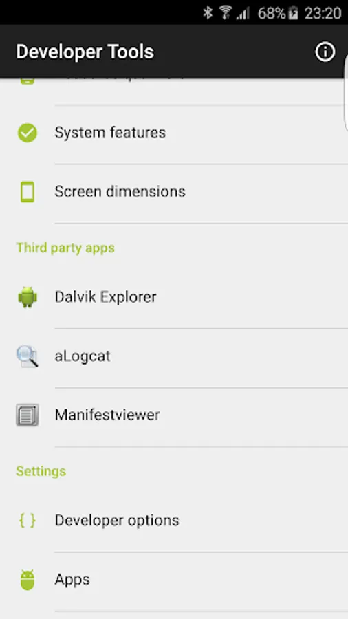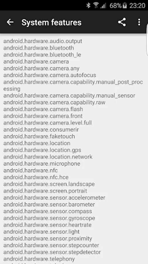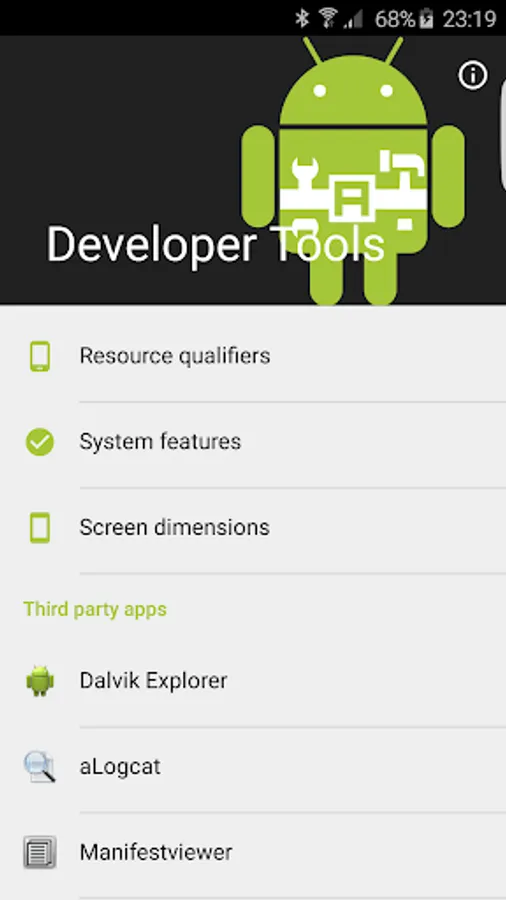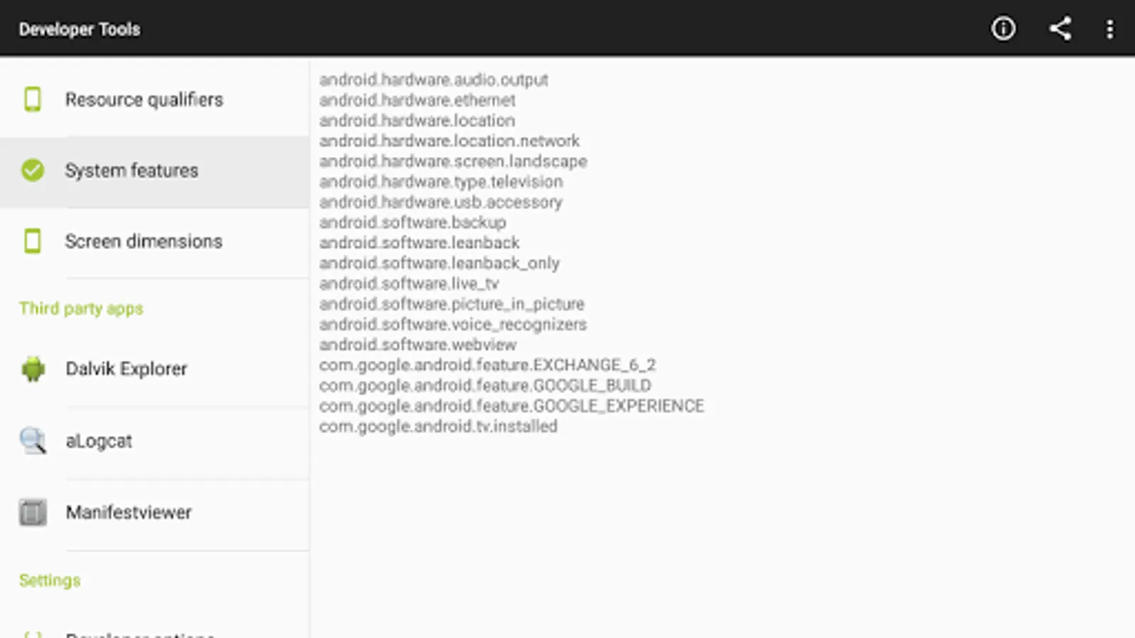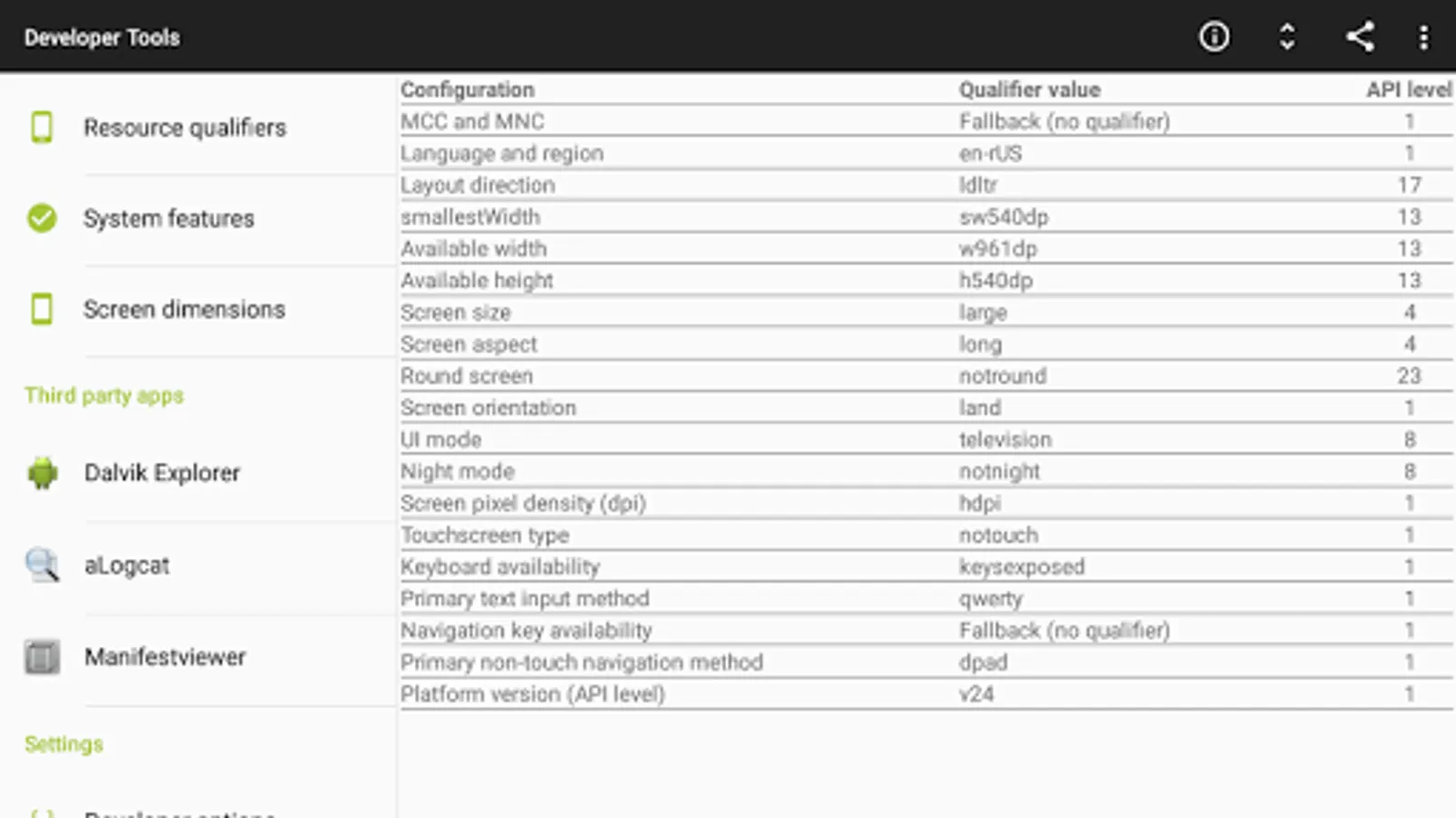 Using this app you can see which resource qualifiers that are being used, which system features that are available, and see details about the display and its sizes.