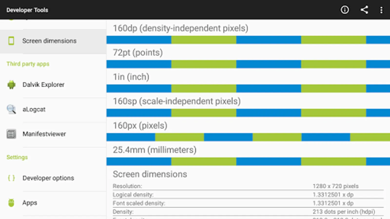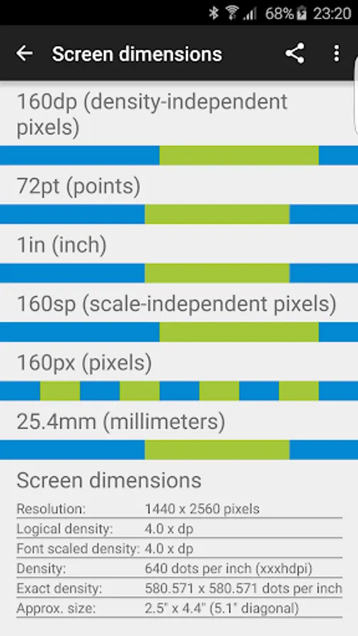 - See screen dimensions in dp, pt, in, sp, px, mm