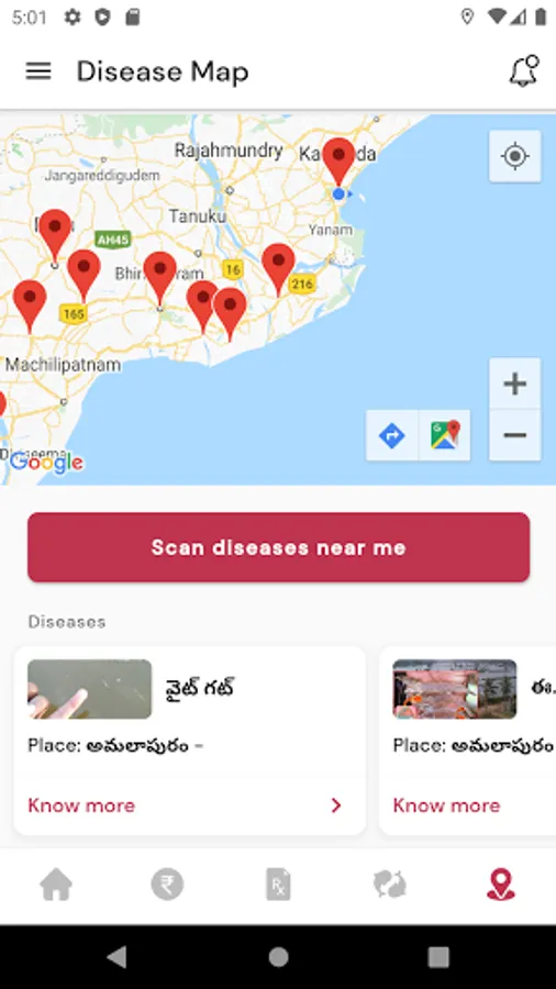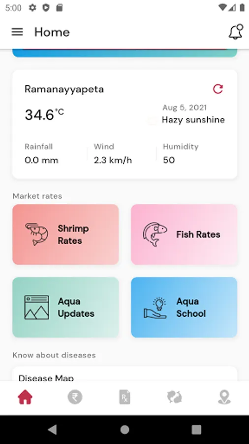 Two central problems of an aqua farmer are the sudden animal stress due to weather conditions and disease outbreaks. The Royye Raju app has been designed to ensure that every aqua farmer is updated in real-time on their local weather information. Farmers can also check out the significant diseases around their locality with our robust disease scanner and take necessary precautions to prevent infection in their culture.