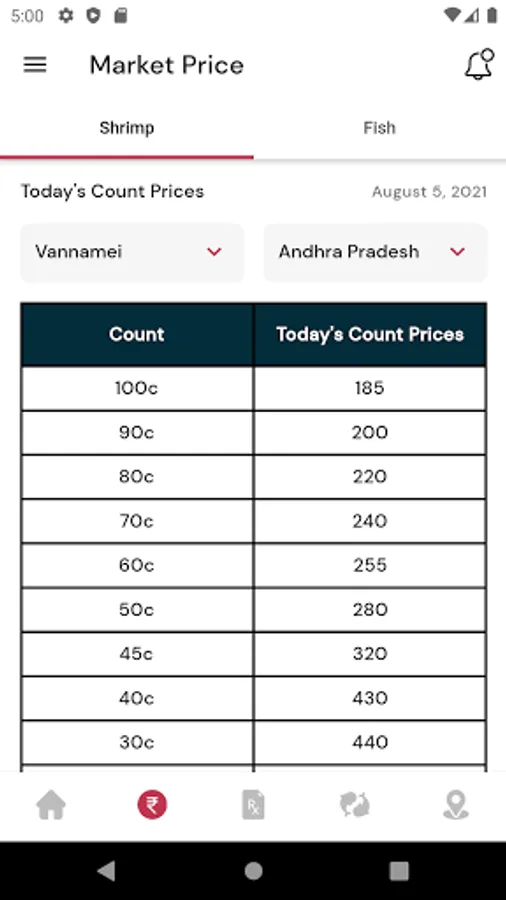 Royye Raju app features daily updates on vannamei, monodon, and fish varieties market prices. In addition, daily shrimp and fish count rates allow the farmer to get the best price for his produce and enable them to plan their harvest as per the market trends.