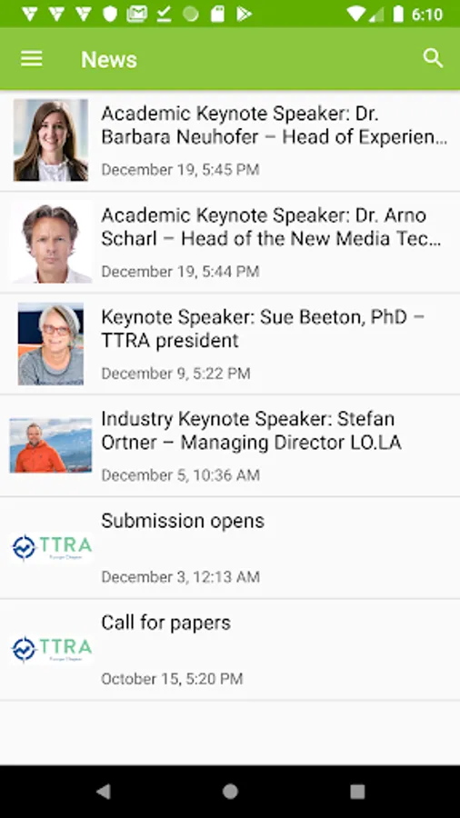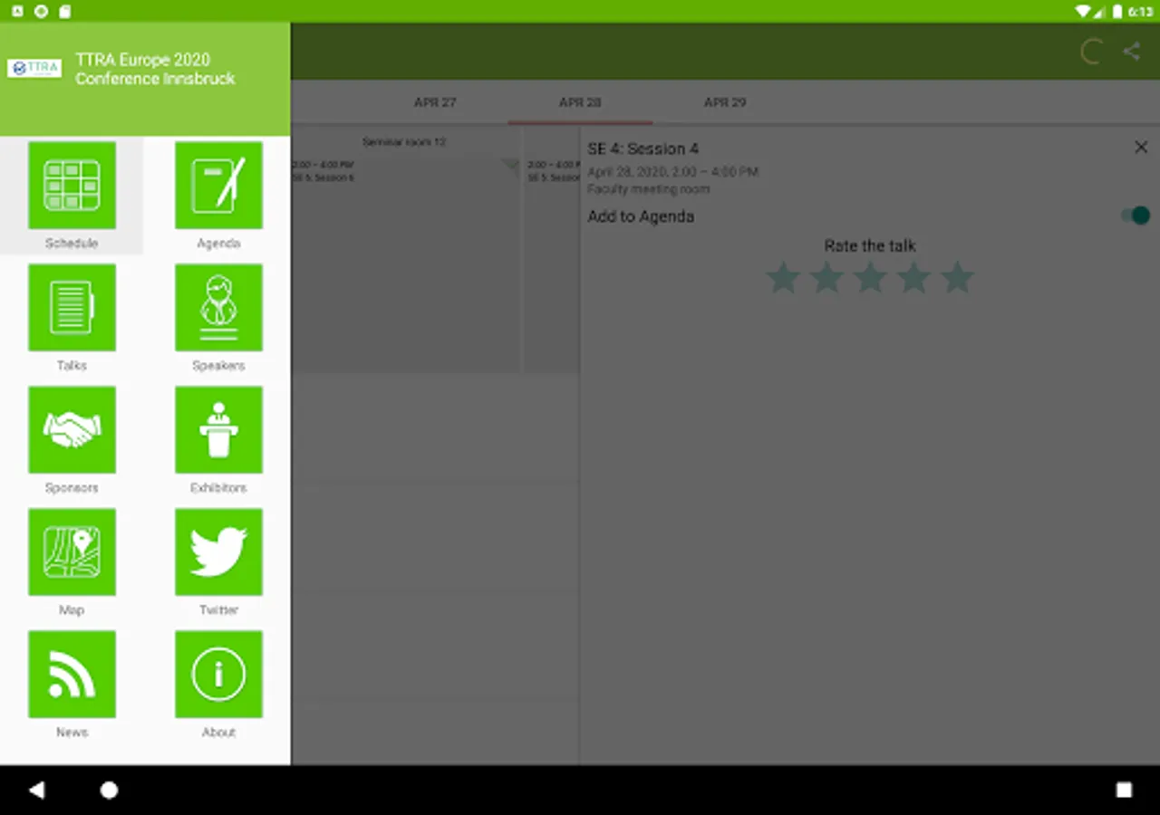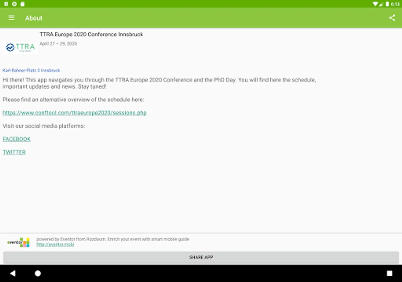 Hi there! This app navigates you through the TTRA Europe 2020 Conference and the PhD Day. You will find here the schedule, important updates and news. Stay tuned!