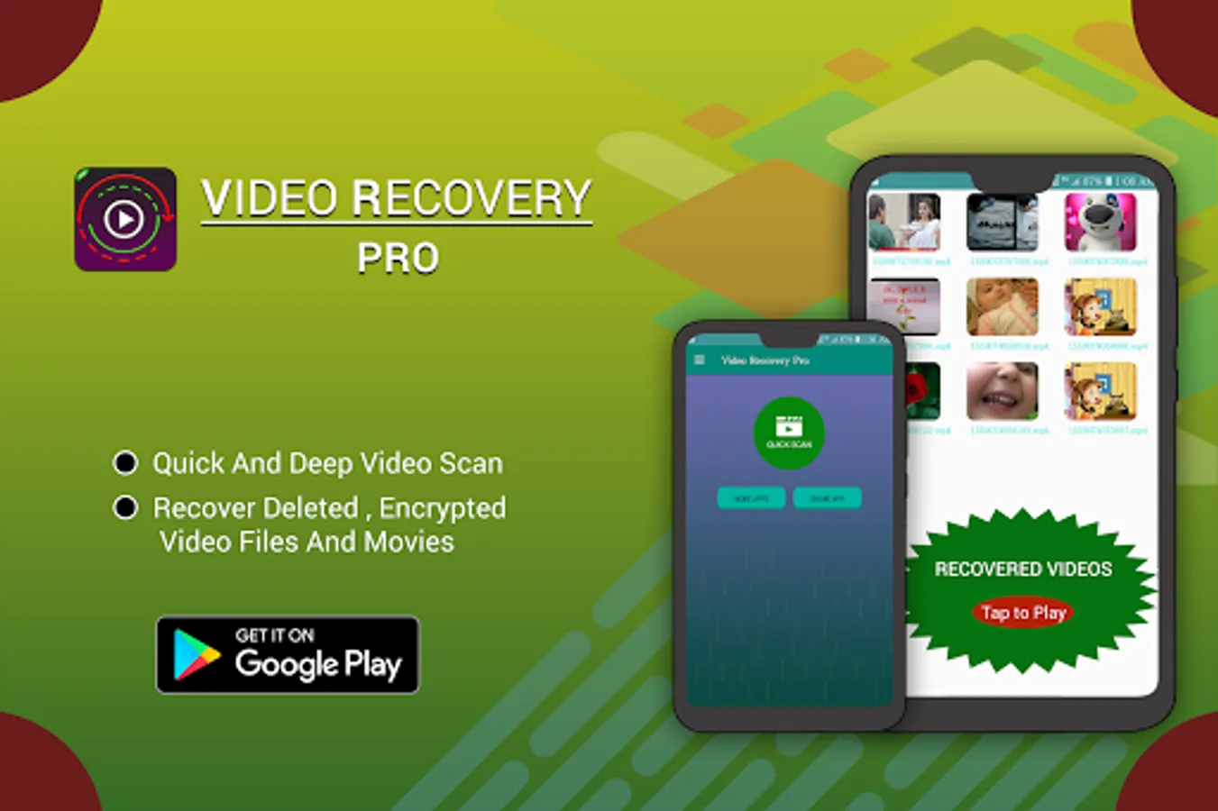 Deleted Video Recovery-Pro is amazing app which will help you to recover and restore Deleted and encrypted(hidden) Video files,Movies from your device quickly and Easily.
