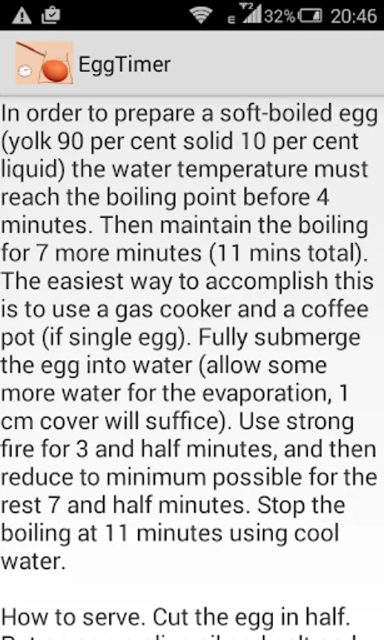 This application will help you to prepare delicious boiled eggs. It is minimal, requires no permissions to run and will not flood you with ads. Enjoy.