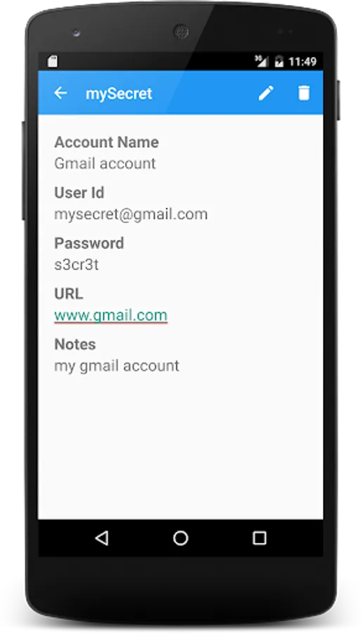 "mySecret - Password Manager" allows you to store usernames, passwords and generic notes in an encrypted database protected by one master password.