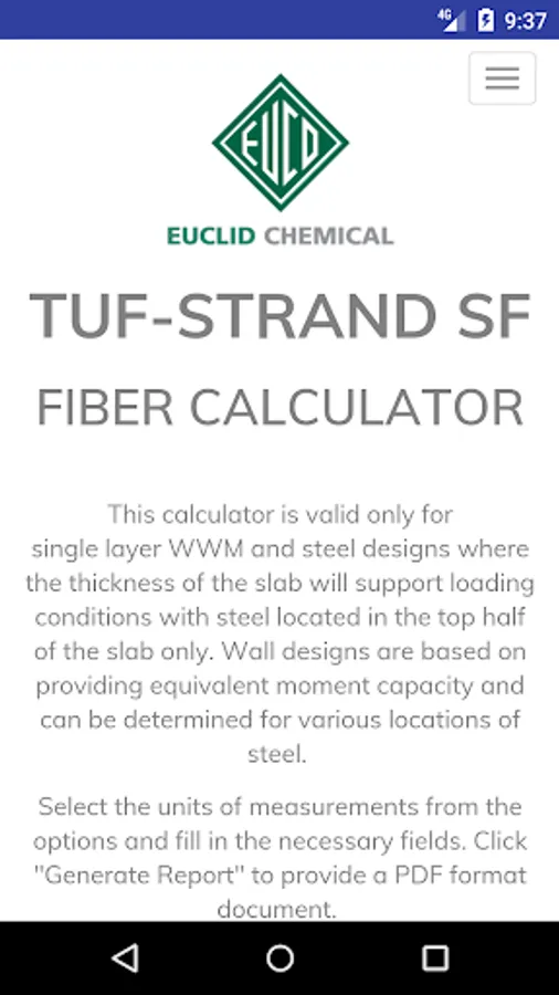The Euco Fiber Calc App allows concrete producers, engineers and contractors to quickly calculate dosages of Euclid's TUF-STRAND SF macro-fiber to replace single layer rebar and wire mesh in floors and walls for temperature and shrinkage crack control.