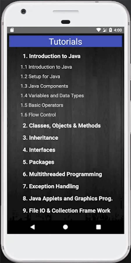 This application provides compiled and consoled tutorials. As well, it provides extra programs and the unique coding ground for Java users, where learner can write and run own programs and test own programming skills as learner learn. Tests will help learner to evaluate himself/herself throughout this application. Also this application will be supportive to anyone preparing for company interviews or for entrance examination via interview questions provided in this application.