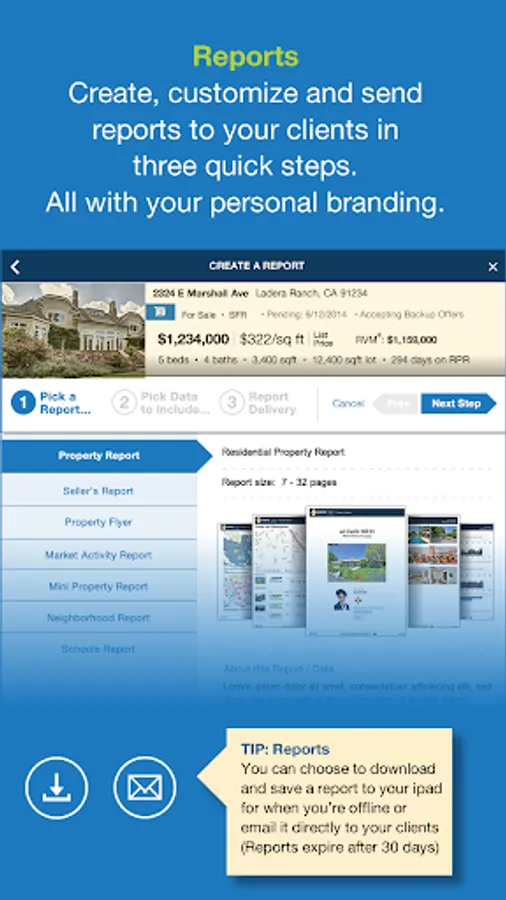 • Create, email, or save branded reports: property report, mini-property report, seller’s report, market activity report, neighborhood report and property flyer