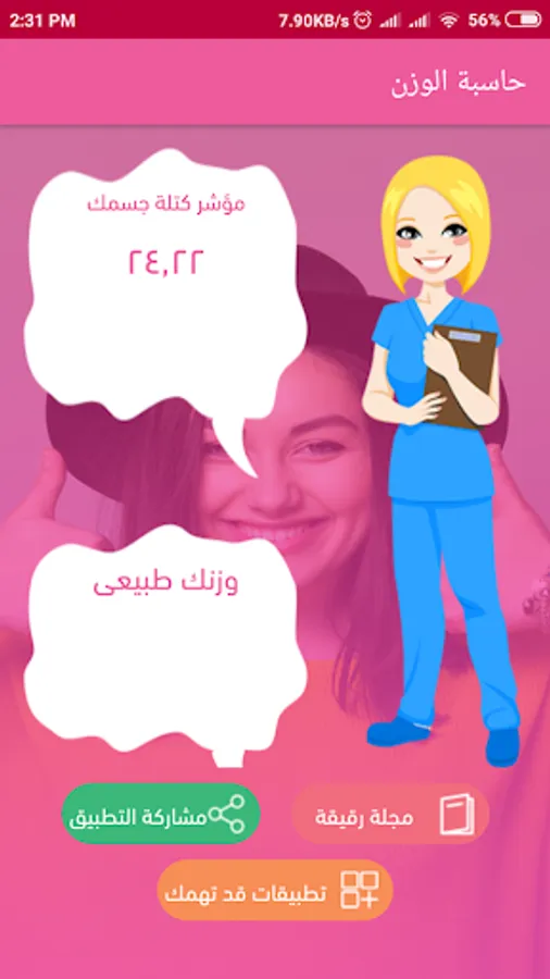 The application measures the body mass index (BMI), which is the weight in kilograms divided by the square of length in meters, and the result is normal if it is between 18.5 and 25.