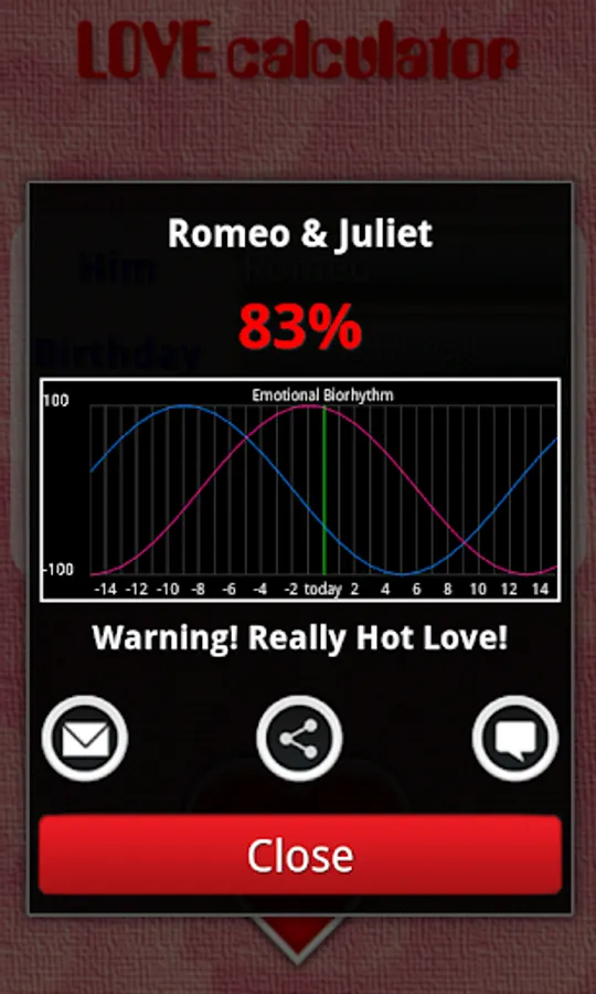 If you select both dates of birthdays, the calculator will also show the graph of your emotional biorhythm then, if you wish, you can share the obtained result via: email, SMS, Facebook, Twitter or WhatsApp.