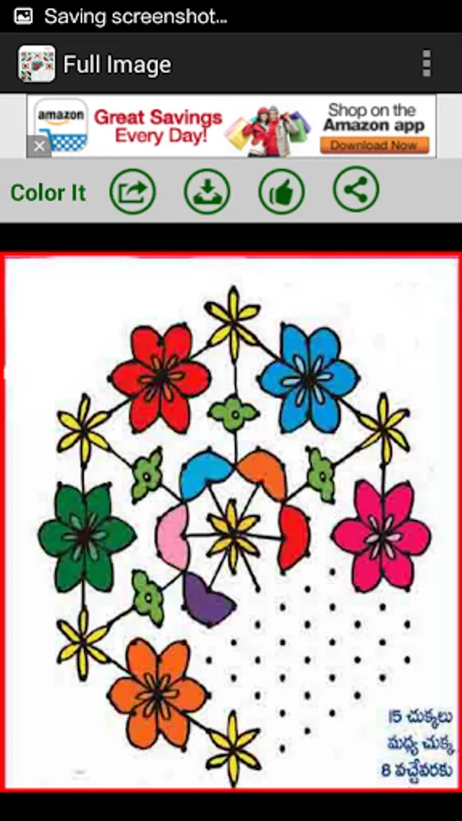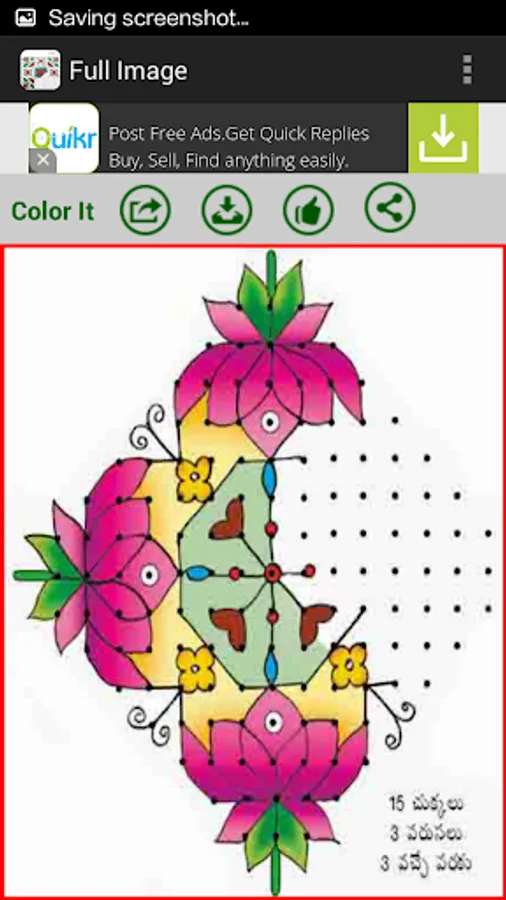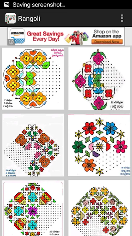 Rangoli , also known as kolam or muggu is a folk art from India. Typically consisting of bright colors, rangoli is a decorative design made in living rooms and courtyard floors during Hindu festivals . They are meant to be sacred welcoming areas for the Hindu deities.