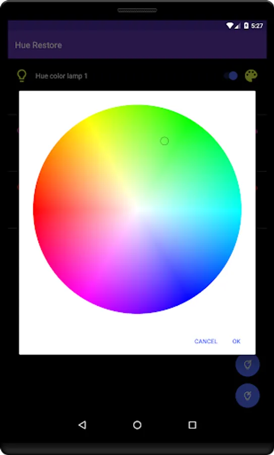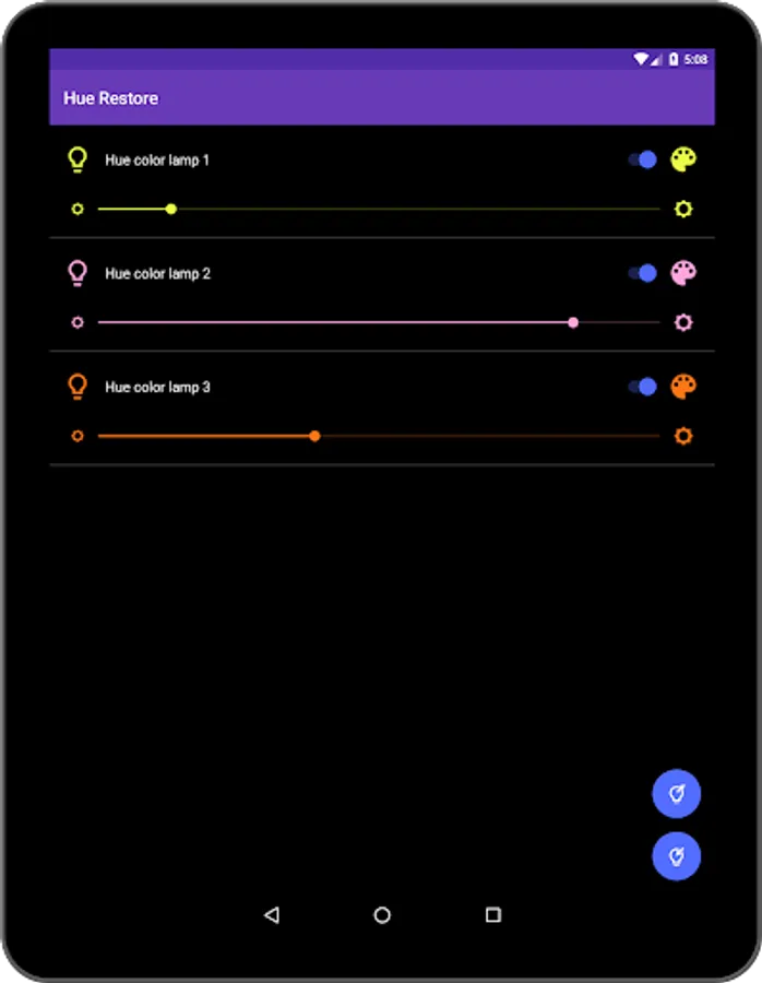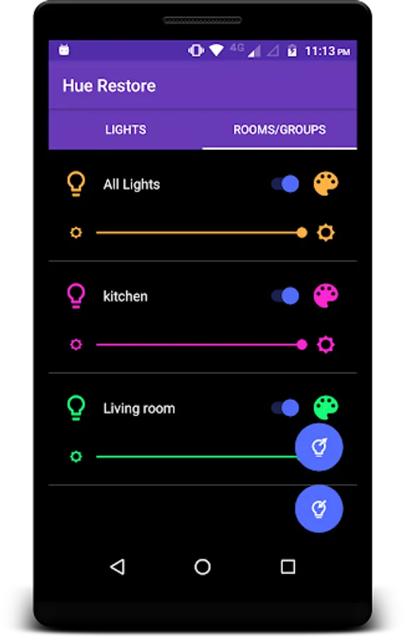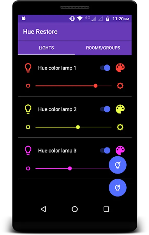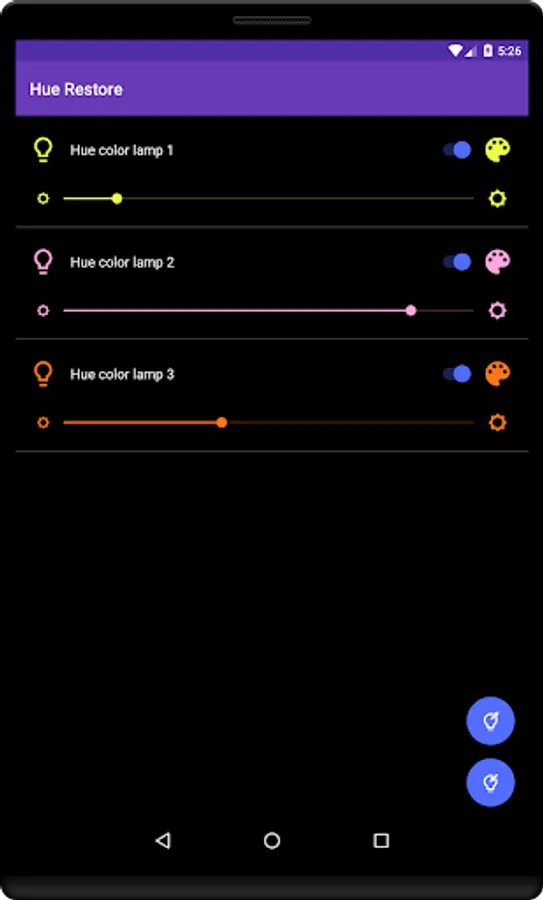As a bonus you can also tweak your Philips Hue lights from the app itself. Hue Restore allows you to change bulb color, brightness or on/off state with a simple and intuitive user interface. Offcourse, when you change bulbs from Hue Restore app, settings are automatically saved.