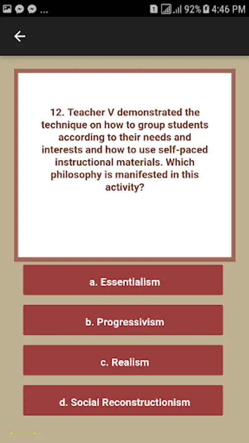 In this Let Reviewer: Professional Education app, you will get to answer some hard quiz that are related to the Professional Education for being a teacher.