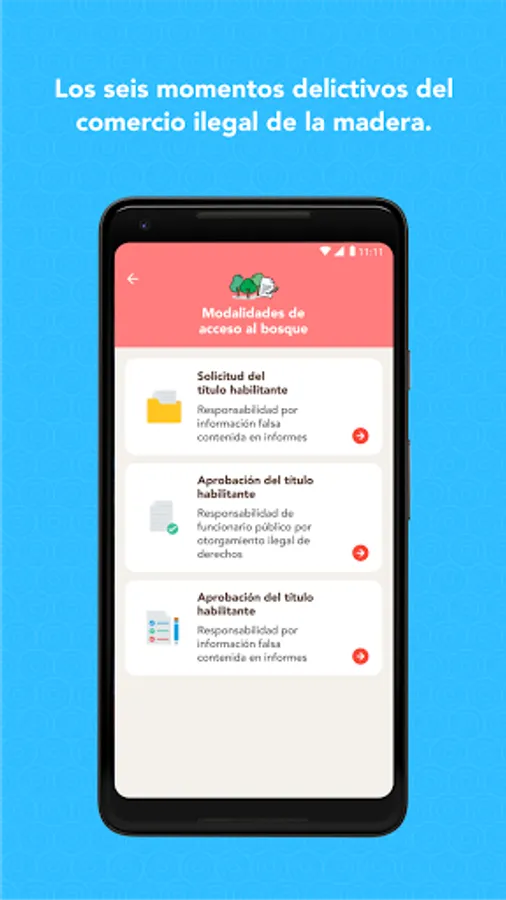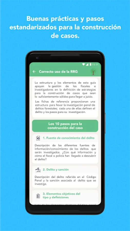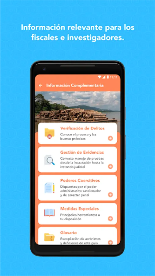 Within the framework of the project “Criminal Justice Responses to Forest Crimes in Peru”, UNODC with the project partners has developed a mobile version of the technical tool - The Reference Guide for Investigation of Forest Crimes (RRG) for support investigators in building cases against illegal timber trade. This mobile application allows the authorities in charge to access technical information in a simple and dynamic way on their cell phone. The App includes the technical reference material of the guide transferred to a mobile interface with interactive functions and can also be used as a tool to generate awareness and trainings.