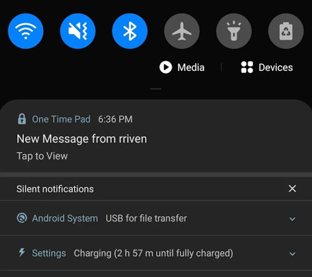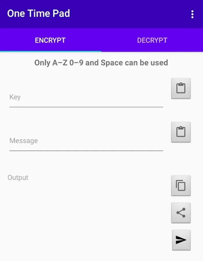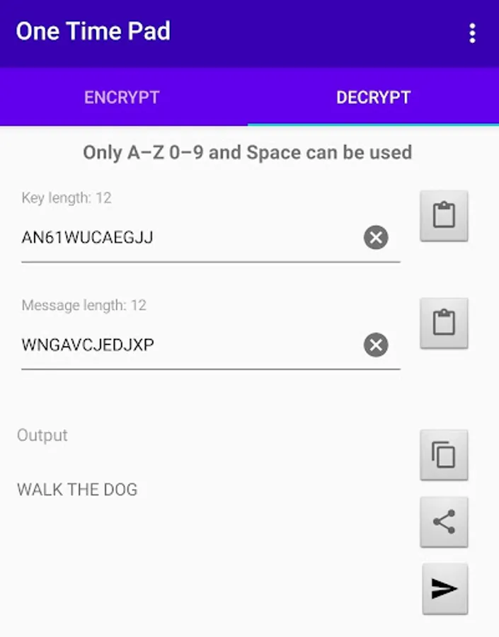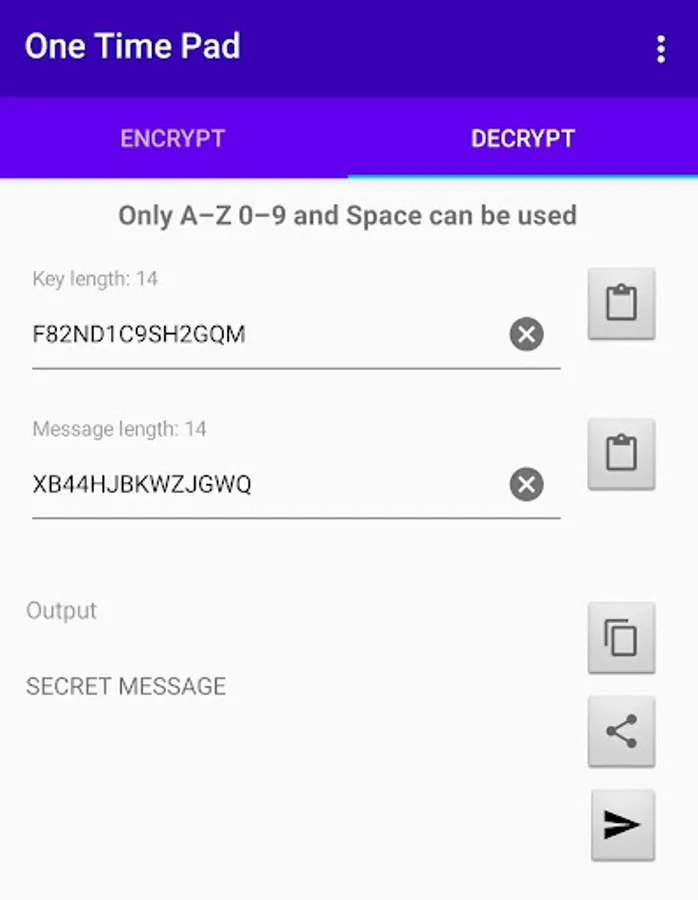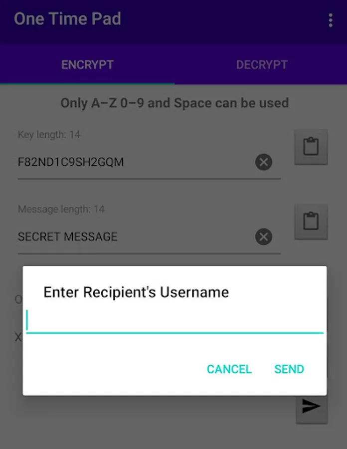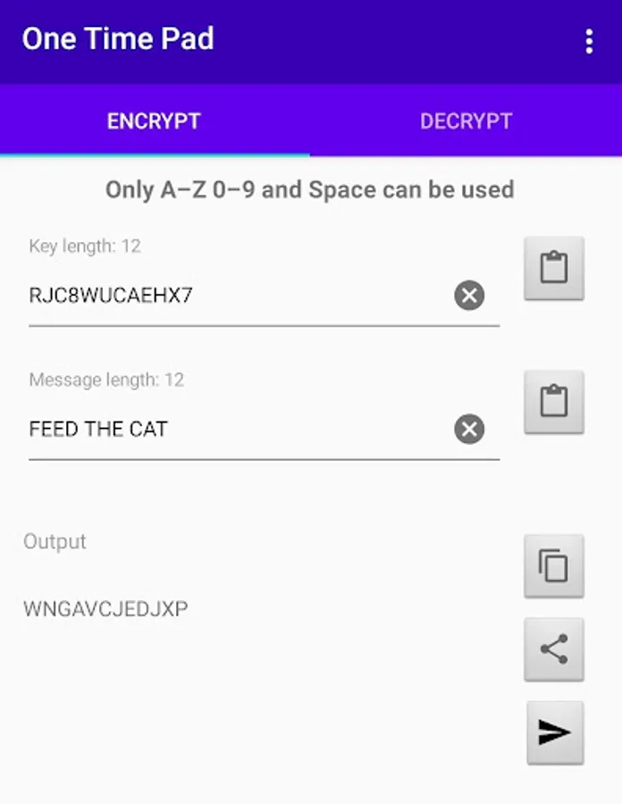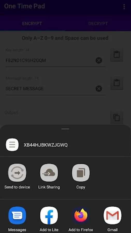 You can share your encrypted message via text, email, direct message, or upload to OneTimePad.app