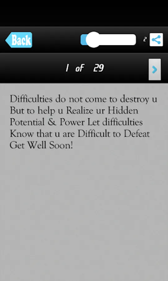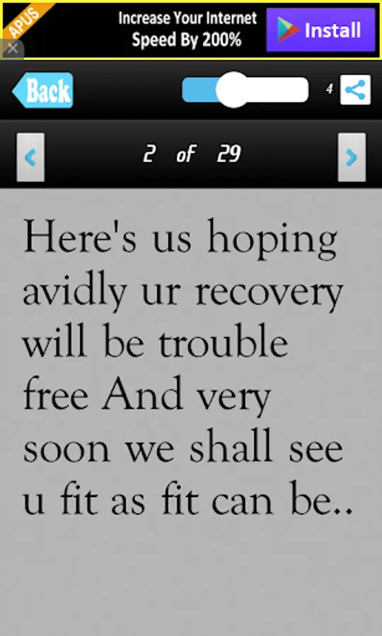 Hello!!! This application contains very sweet get well soon messages. When you download the application you will get many get well soon greetings to send your mates every day. You may be interested to send a very best get well soon wishes to your friends and relatives to keep them happy. We have get well soon quotes and messages for you free of cost.
