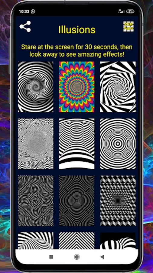 Just select an illusion effect from the menu and stare at the center of the screen for at least 30 seconds. Then look away and you will see amazing optical effects, you will not believe your eyes!
