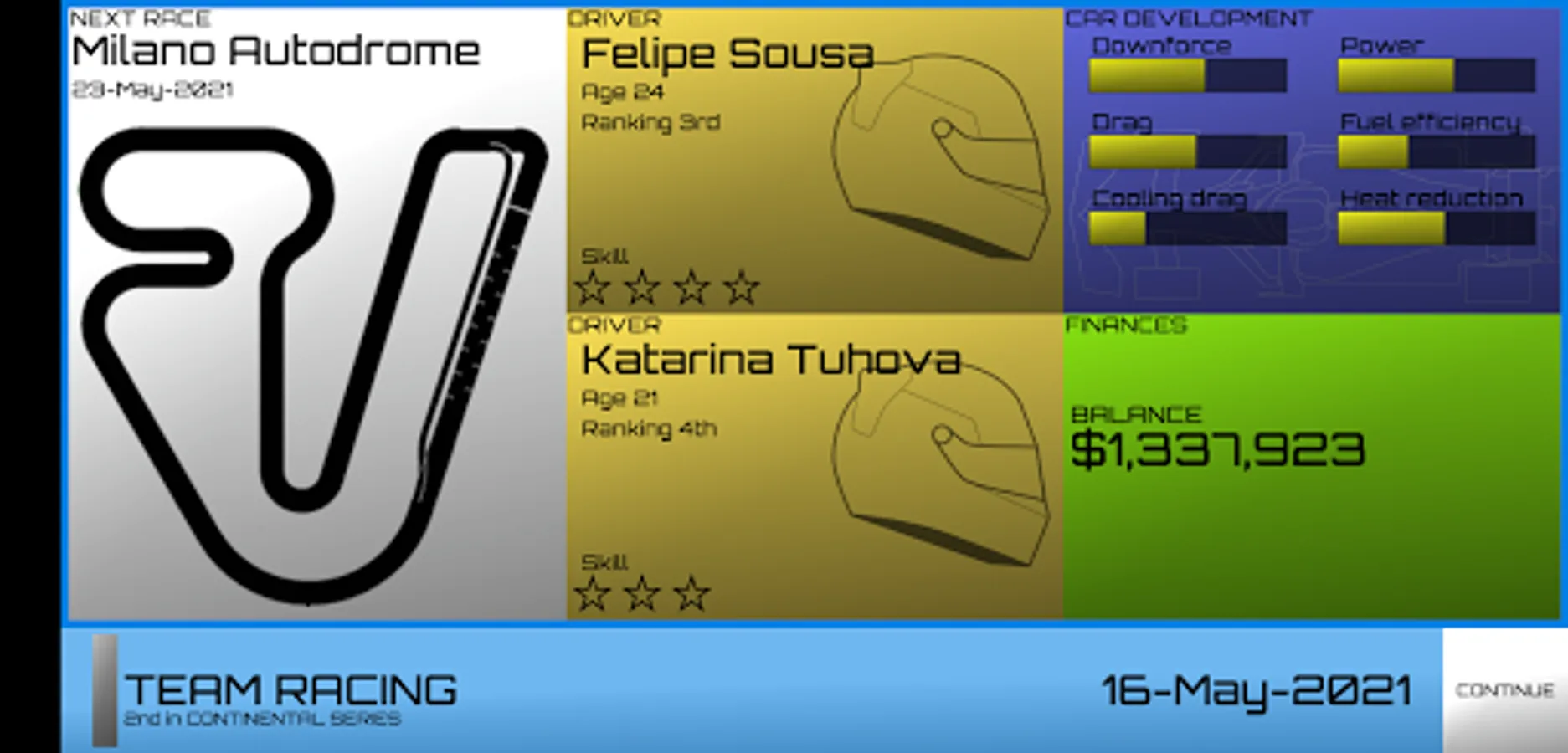 Between races invest in car development, hire drivers and sign sponsors.