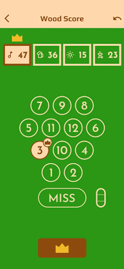 If a player misses (has no score) three times in a row, he/she is out of game and acts as the scorekeeper. The game ends when the first player reaches exactly 50 points. If one scores over 50, that players score is lowered to 25.