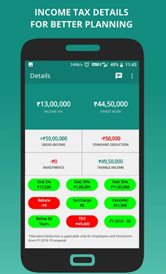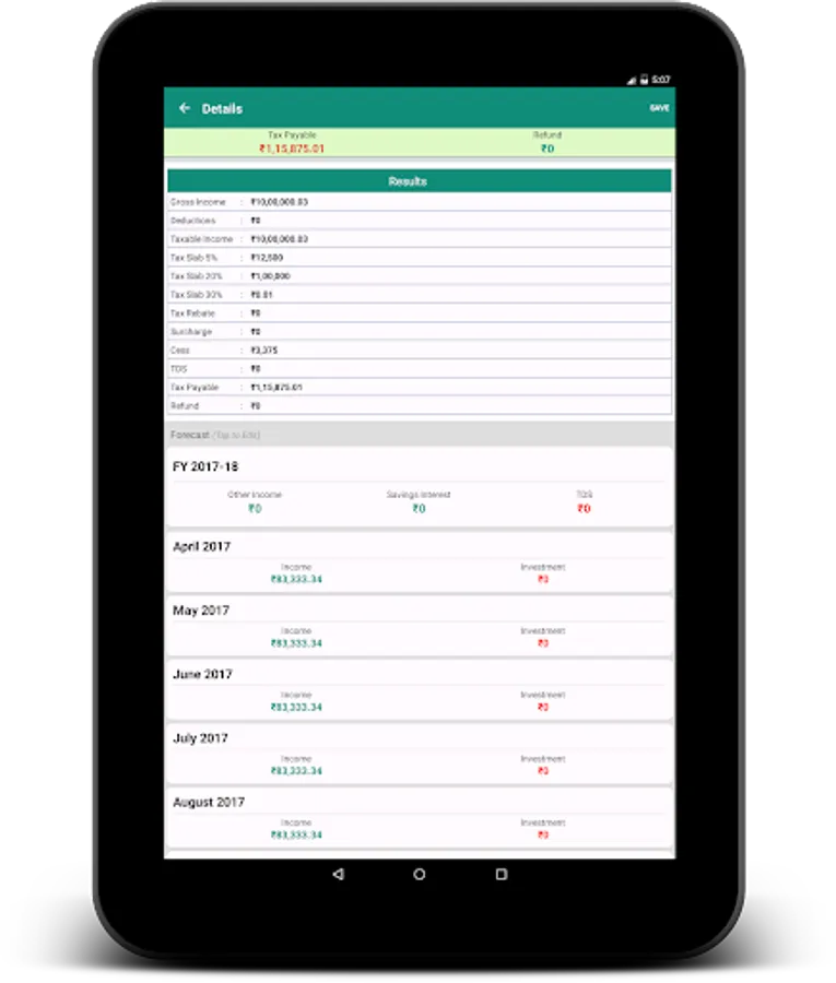 FinCalC Income Tax & Financial Calculators helps you to track your yearly Income Tax payable, every month based on your Salary and Investments made for Tax Exemptions in India.