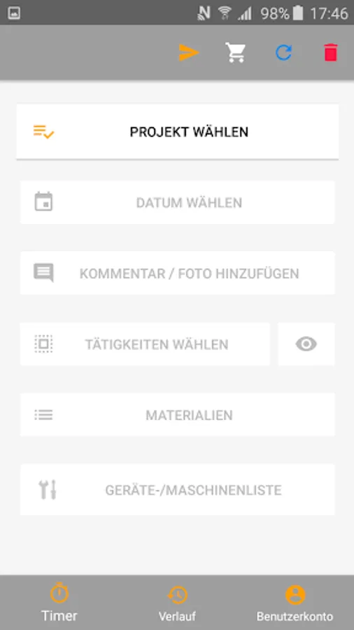 The Android application is designed to make work-tracking and employee attendance as easy as possible for companies and to provide them with data in real time. Employees can record the effective working hours on construction sites with their smartphones, and precise project-related activities, materials used, tools , pictures can be inserted with just a few clicks. Necessary materials and tools are simply put into the cart so that the order is transmitted in real time.