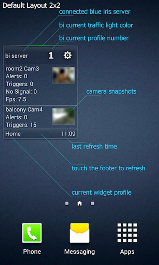 The bottom area of the widget displays the current widget profile, the last refresh time and acts as a manual refresh button. Touch the bottom area of the widget at any time for immediate data refresh from the remote server. With widget profiles, you can define up to three Blue Iris servers and select the active one from the settings.
