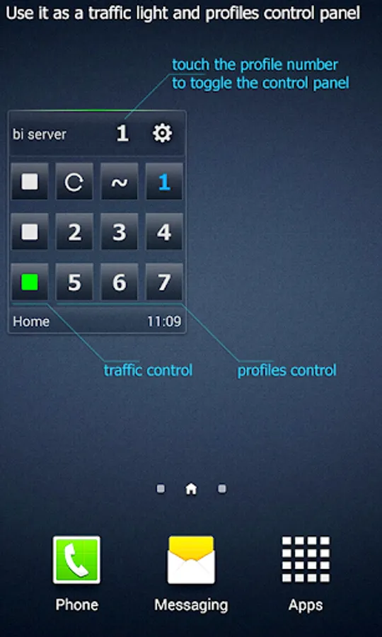 2. Control panel - can be accessed by touching the current profile number. The control panel shows and controls the currently selected profile and traffic light of the Blue Iris server. Switch to the desired profile with one touch from your home screen.