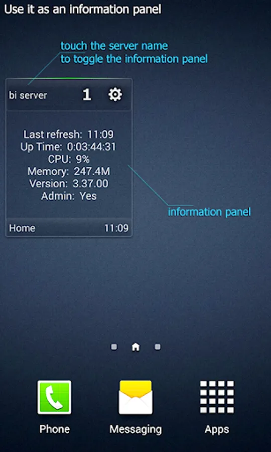 3. Information panel - can be accessed by touching the server name. The information panel will show information from your Blue Iris server as of the last refresh. Tip: in case you do not want to see a camera list on your home screen, turn off the snapshots, resize the widget to 2x2 and turn on the information panel for an elegant minimal widget.