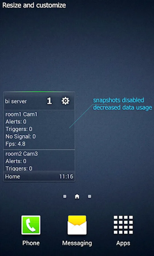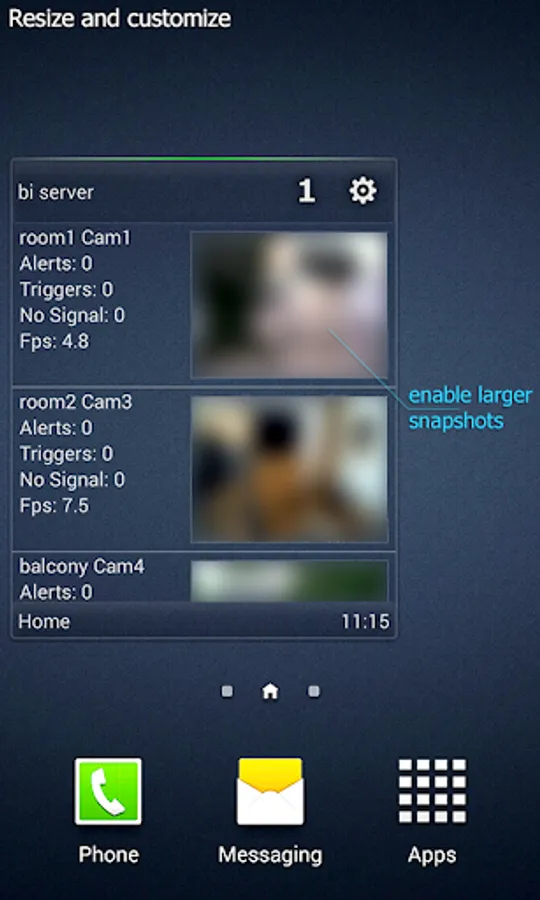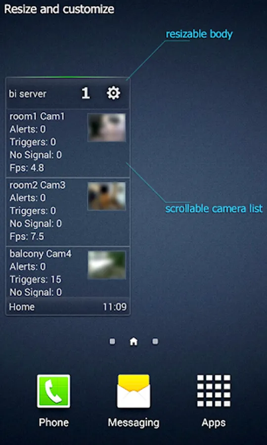 1. Camera list - shows the camera snapshots from last refresh and important camera information. The camera snapshots can be increased or decreased in size, according to the needed widget layout. It is also possible to hide the camera snapshots from the list which will also prevent snapshot download and potentially save mobile data.