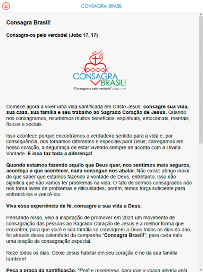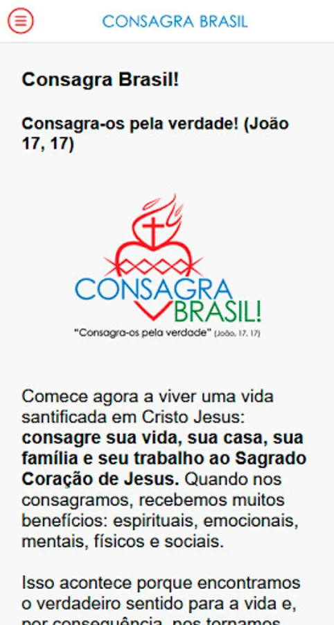 Welcome to the Consagra Brasil Application, developed by the Association of the Lord Jesus. Begin now to live a sanctified life in Christ Jesus: consecrate your life, your home, your family and your work to the Sacred Heart of Jesus.