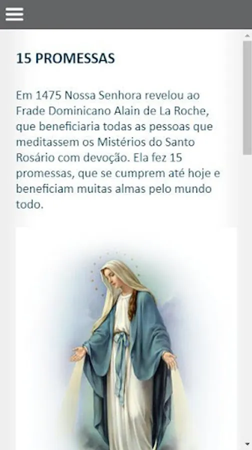- To delve deeper into the documents of the 15 promises - In 1475 Our Lady revealed to the Dominican Friar Alain de La Roche, that it would benefit all people who meditated the Mysteries of the Holy Rosary with devotion. She made 15 promises, which are kept to this day and benefit many souls around the world.